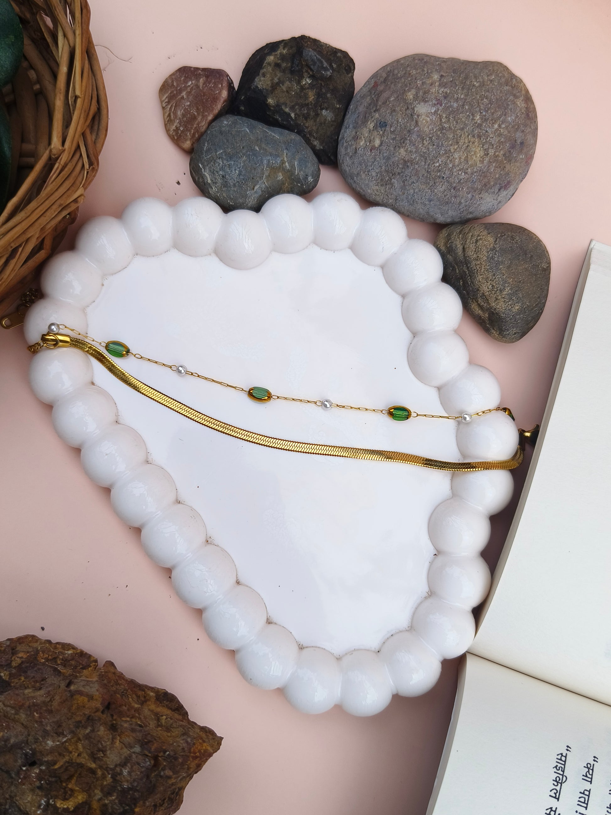 A timeless piece of jewelry, this gold bracelet with green stone detailing adds elegance and sophistication to your look. Designed with a sleek chain and delicate gemstone accents, it’s perfect for both daily wear and festive occasions. Lightweight, versatile, and chic—an ideal gift for someone special or a stylish addition to your collection.