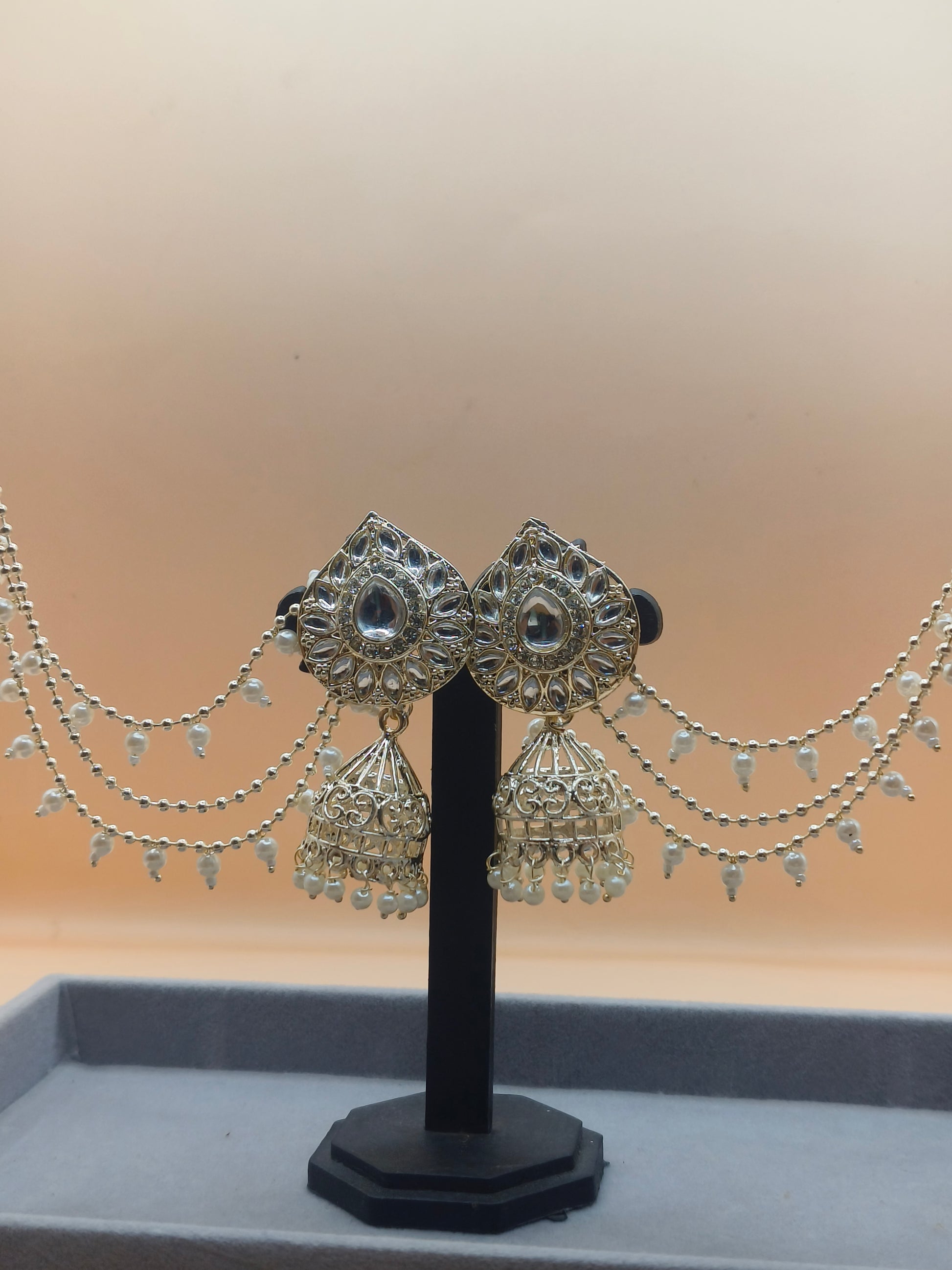 Elegant Silver-Plated Pearl Jhumka Earrings with Layered Chains