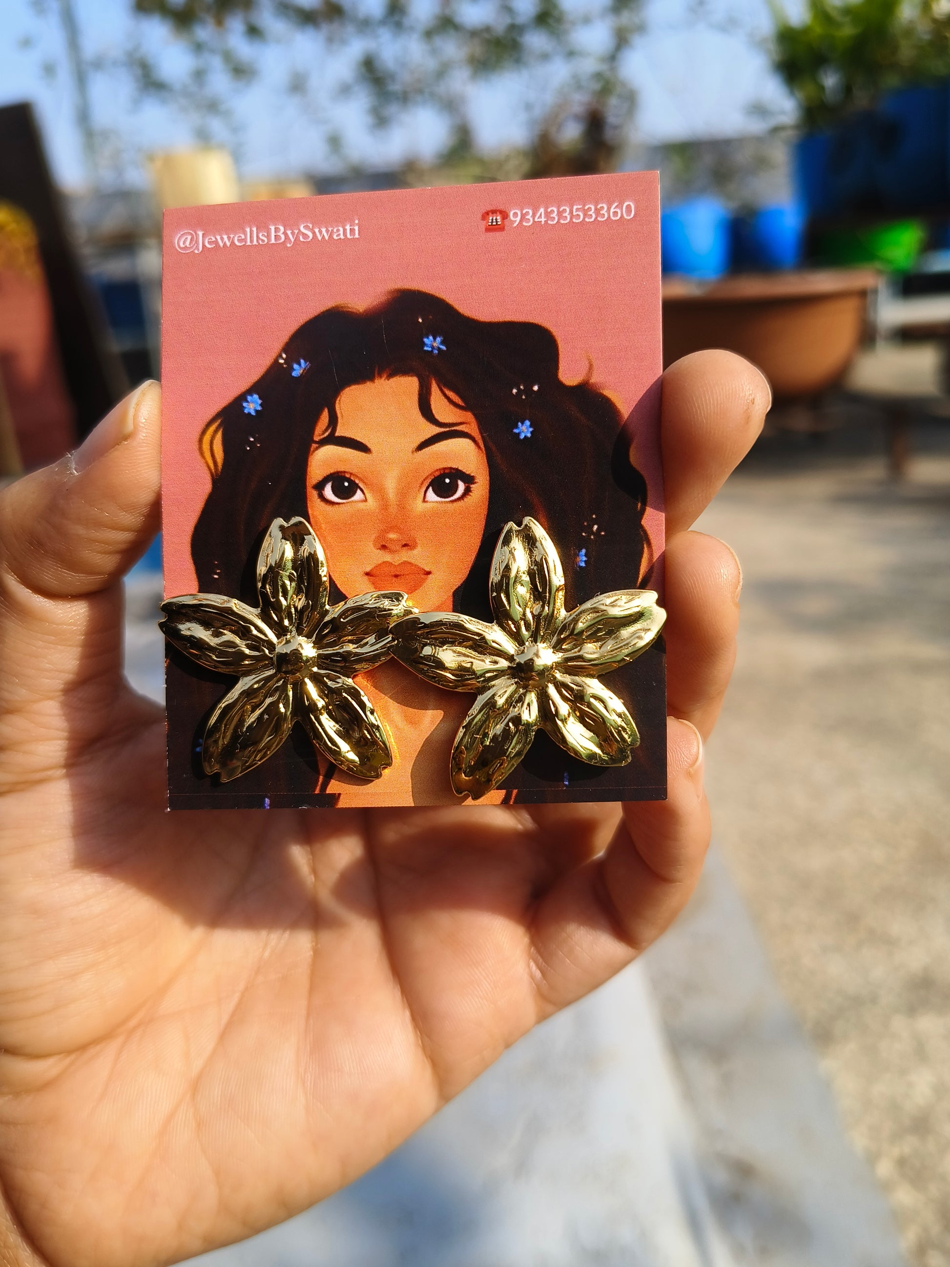 These beautiful gold floral textured stud earrings feature a bold five-petal flower design with a glossy, handcrafted look. Their eye-catching shine and detailed petal texture make them perfect for elevating any outfit—festive, party, or everyday wear.