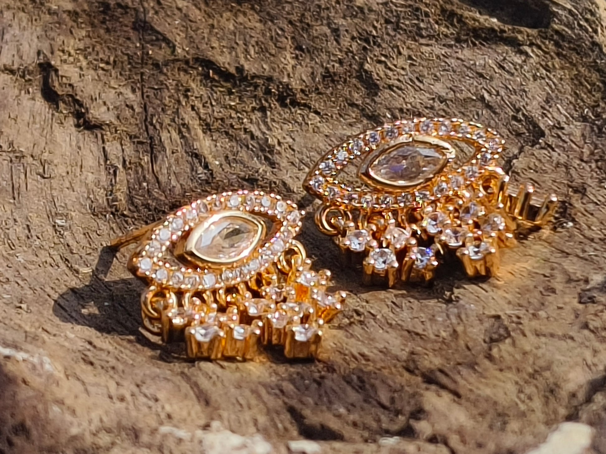 Diamond drop earrings. Designed with a beautiful teardrop center stone and surrounded by sparkling AD stones, these earrings feature delicate dangling accents that catch the light with every movement.