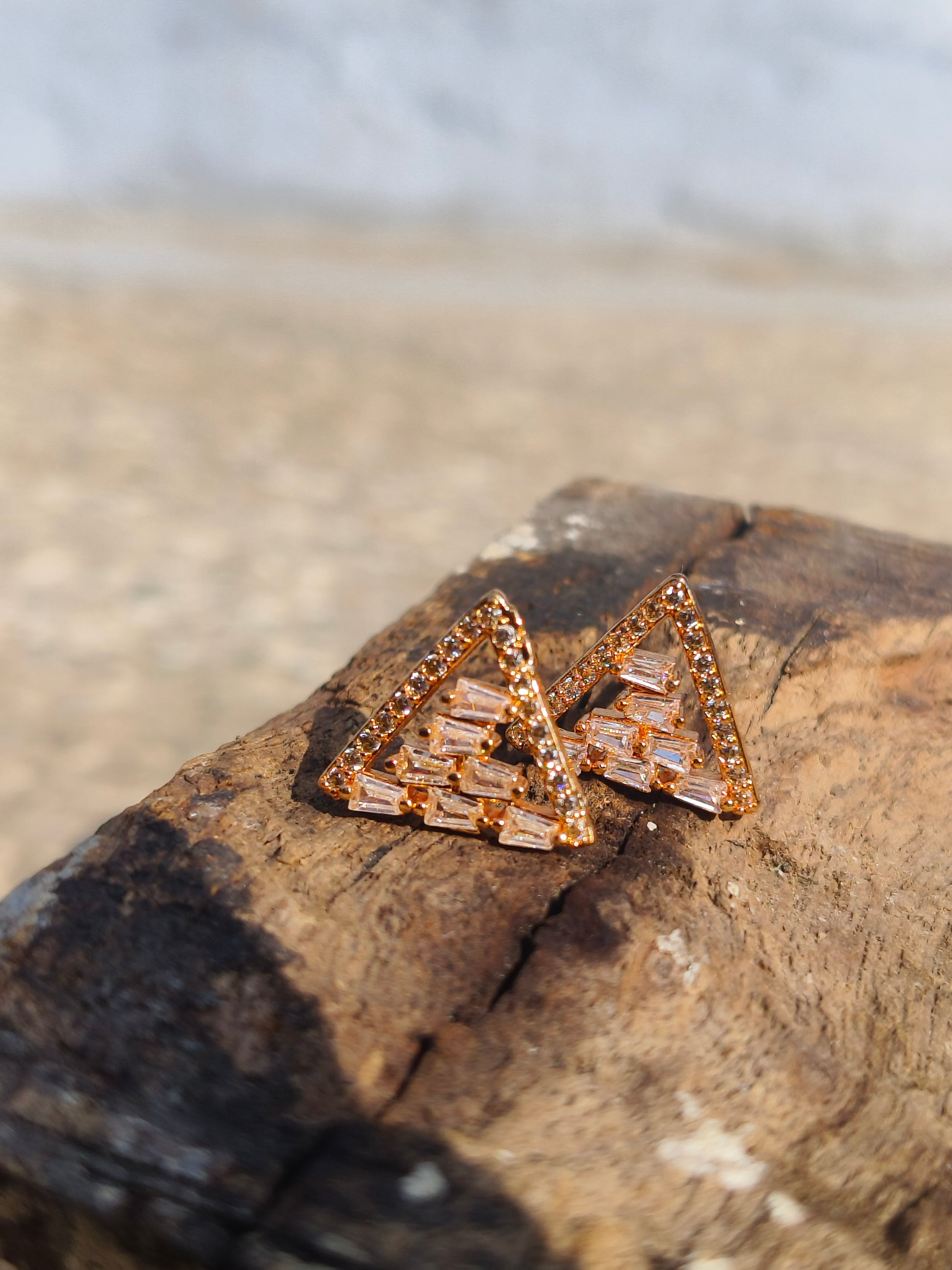 Elevate your everyday and party looks with these elegant gold-tone geometric triangle stud earrings. Crafted with shimmering American Diamond stones, the design features a modern triangular frame accented with baguette-cut crystals for a refined sparkle.