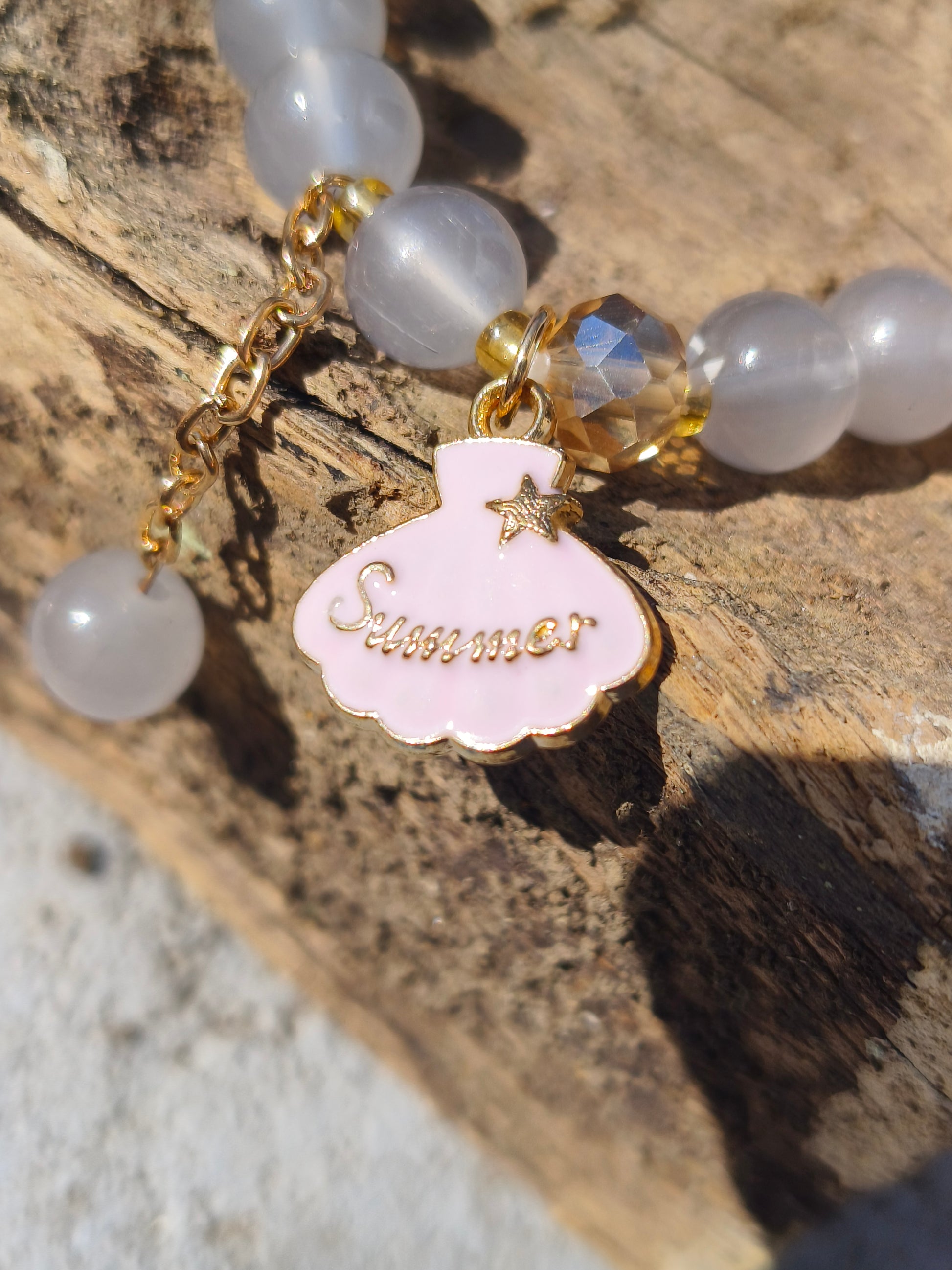 Elevate your everyday style with this elegant grey beaded bracelet, designed with smooth glossy beads, sparkling crystal spacers, and a delicate “Shimmer” charm in soft pastel pink.