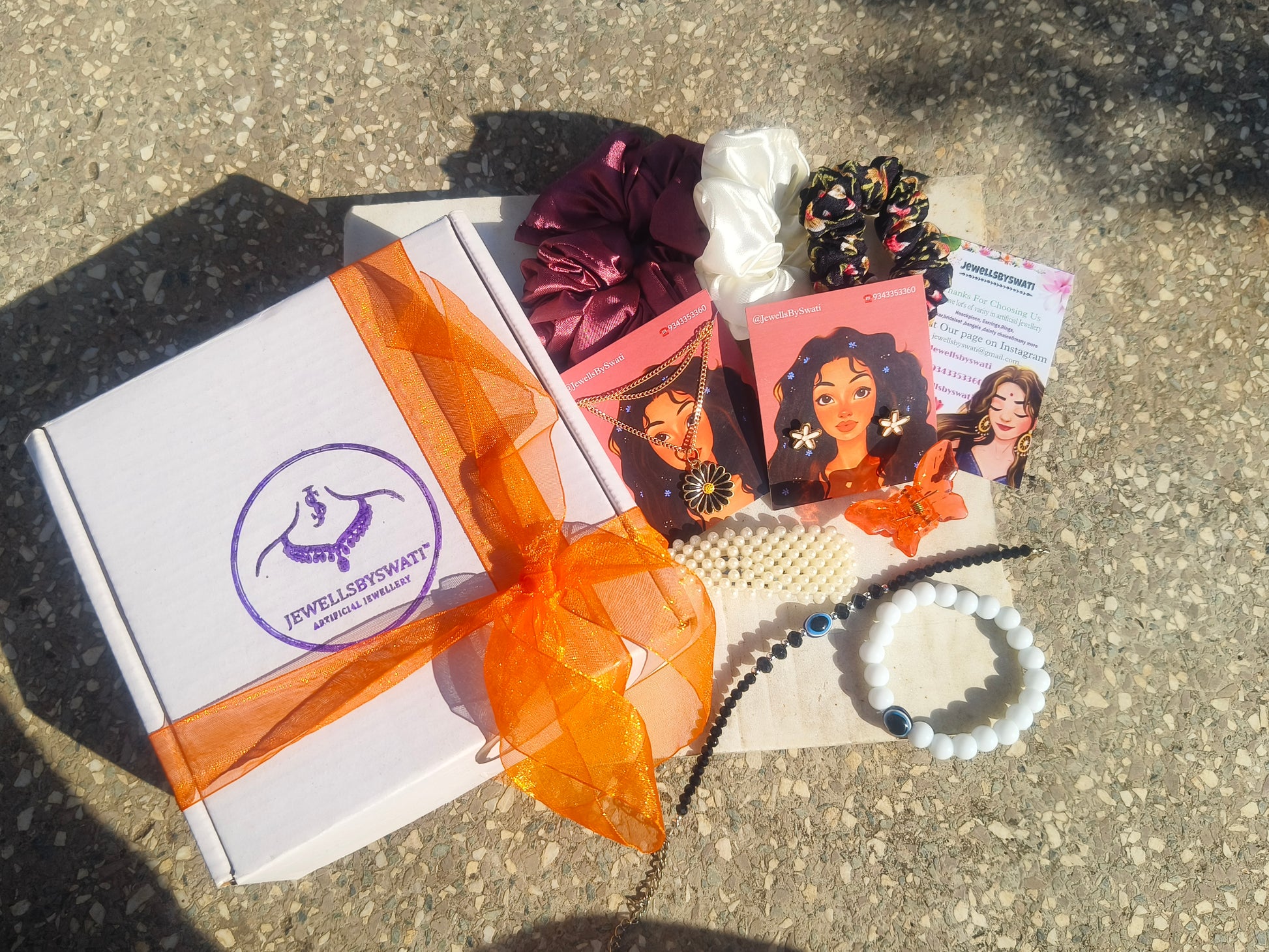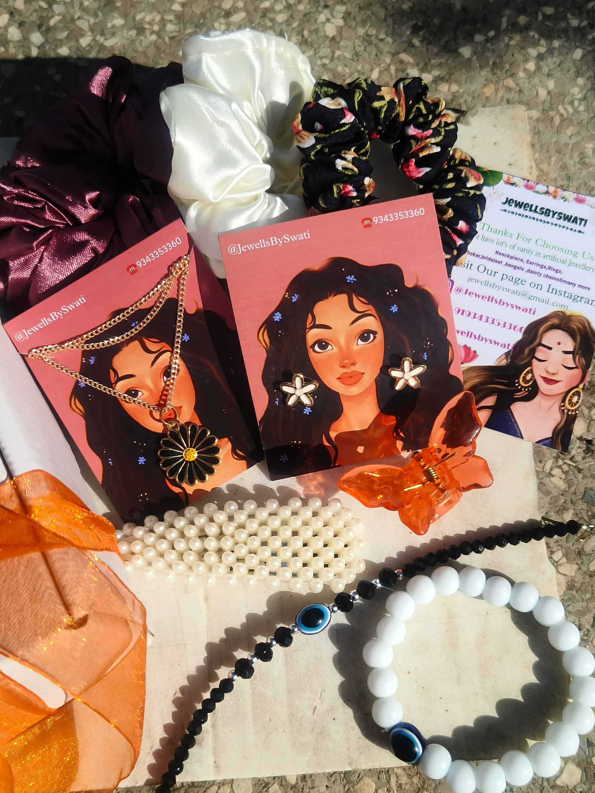 JewellsBySwati Curated Women’s Gift Hamper Set – Artificial Jewellery Necklace & Earrings, Satin Scrunchies, Beaded Bracelets, Hair Claw & Pearl Accessories (Beautifully Gift Packed)
