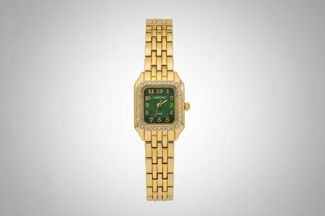 Elevate your everyday elegance with this stunning gold bracelet watch for women, designed to blend luxury with sophistication. Featuring a rich emerald green dial, classic gold-tone numerals, and a beautifully stone-studded bezel, this watch adds a royal charm to any outfit.