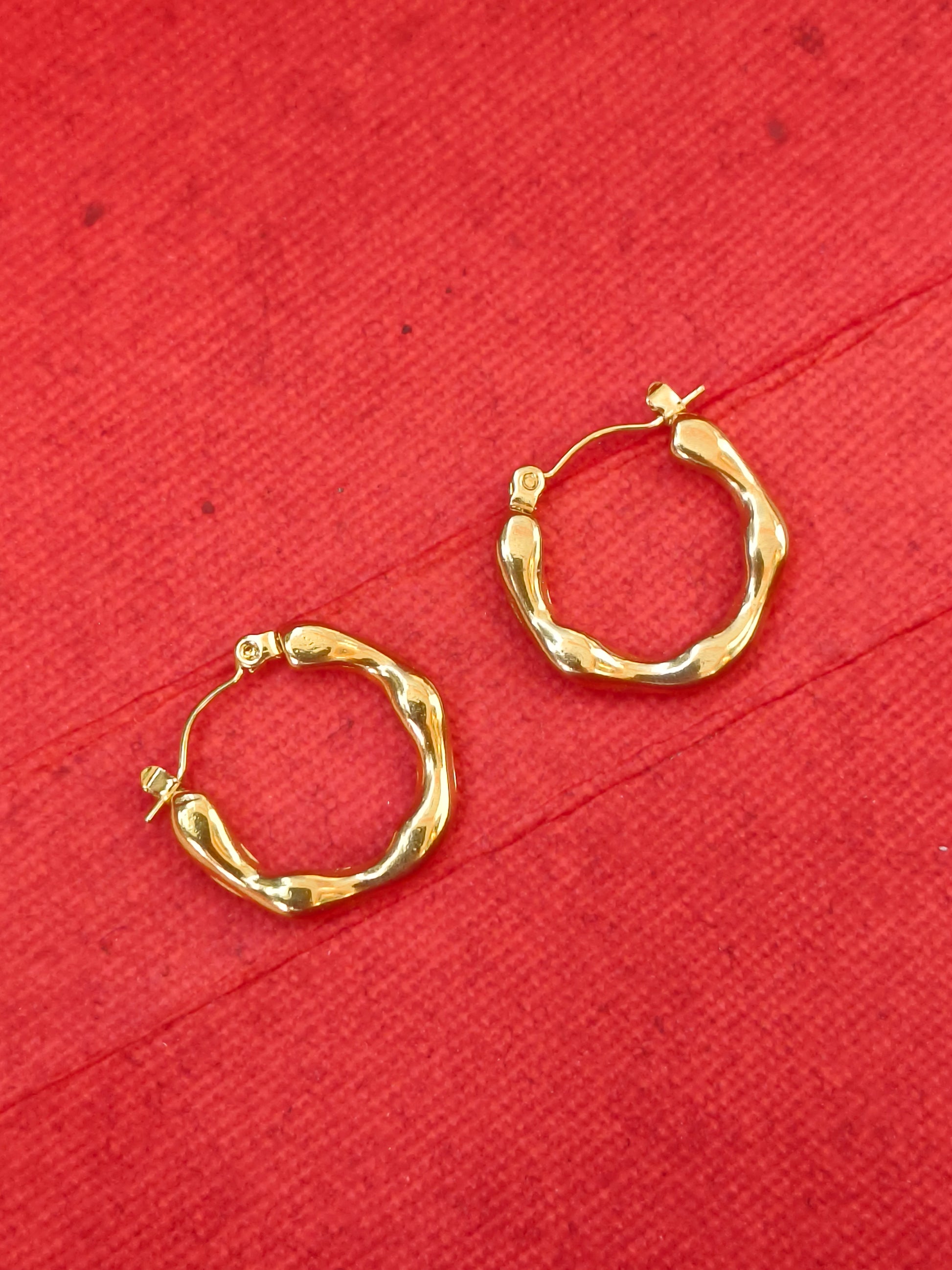 Elevate your jewelry collection with these organic textured anti-tarnish gold hoops, designed to add a chic, modern twist to the classic hoop style. Their unique irregular shape gives them an artsy handcrafted look, while the anti-tarnish finish ensures lasting shine. Lightweight and versatile, they pair effortlessly with everyday outfits as well as special occasions.