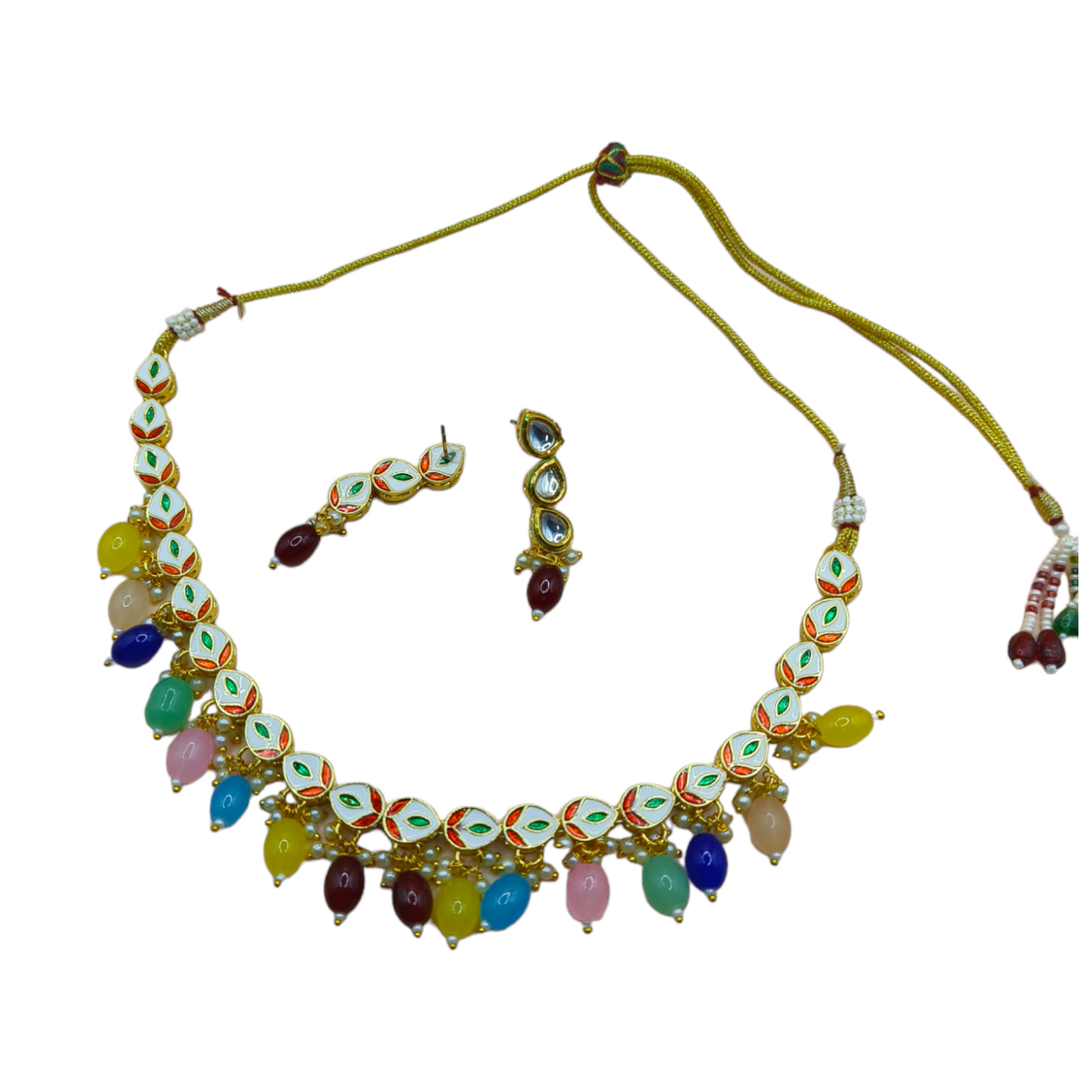 Add a regal touch to your look with this exquisite Polki Kundan Necklace Set, featuring radiant gold plating and dazzling multicolor gemstones. Each teardrop-shaped stone enhances your elegance, while the intricate Kundan work brings a touch of timeless heritage. Perfect for weddings, festive celebrations, and traditional occasions, this statement set comes with matching earrings to complete your royal ensemble