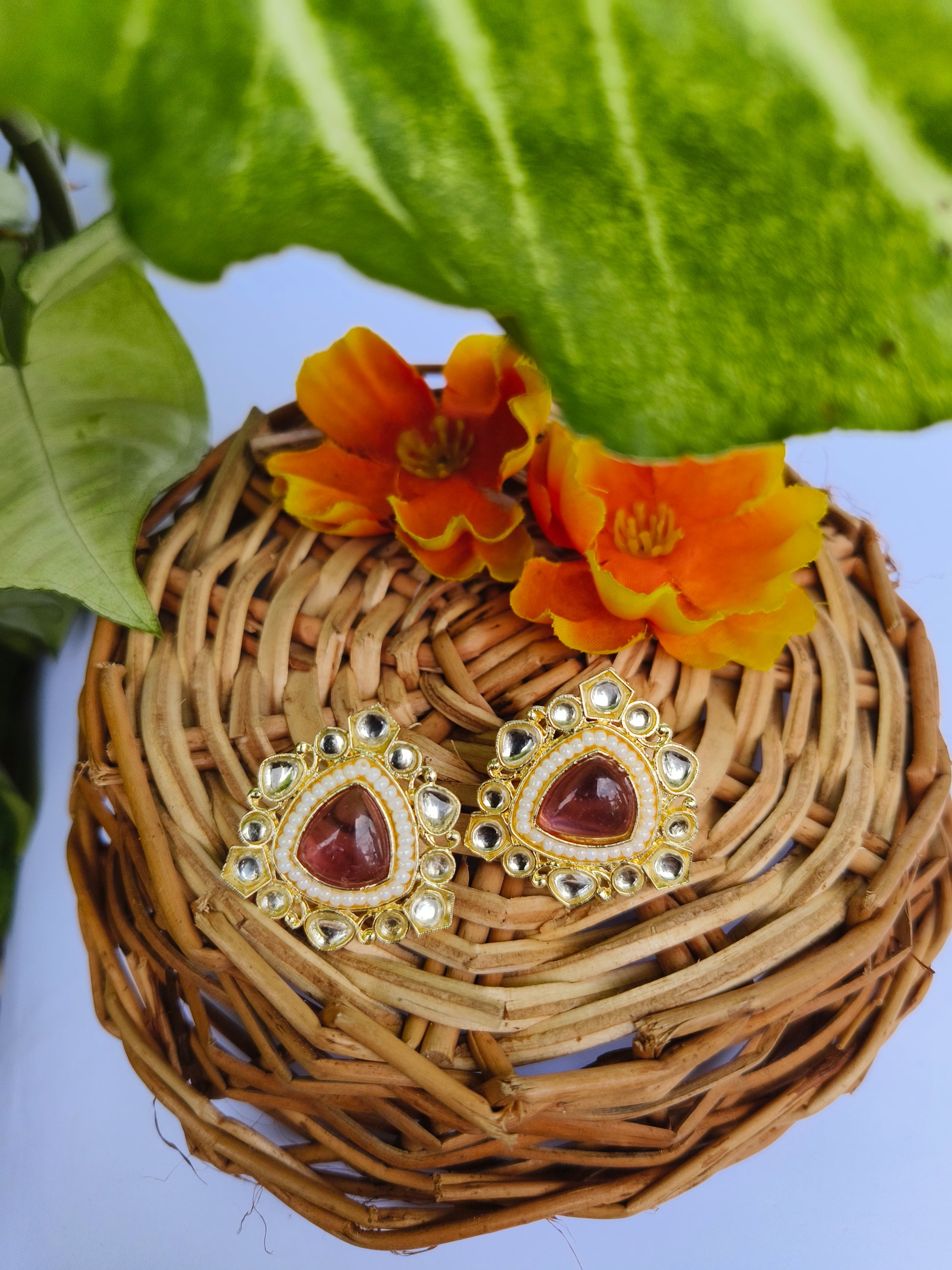 Beautifully handcrafted with a pink center stone and surrounded by premium kundan and pearl detailing — these studs bring a perfect mix of grace and tradition. Ideal for festive occasions, weddings, or everyday ethnic wear.