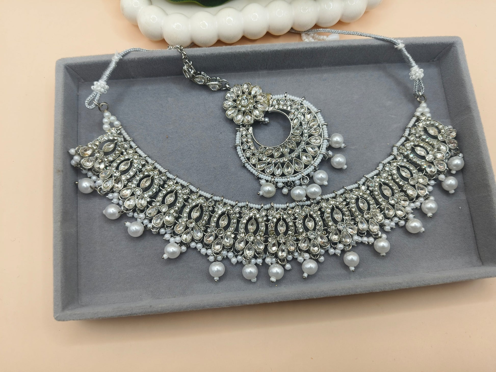Silver Crystal Kundan Choker Set with Pearl Drops & Matching Jhumka and Mangtika