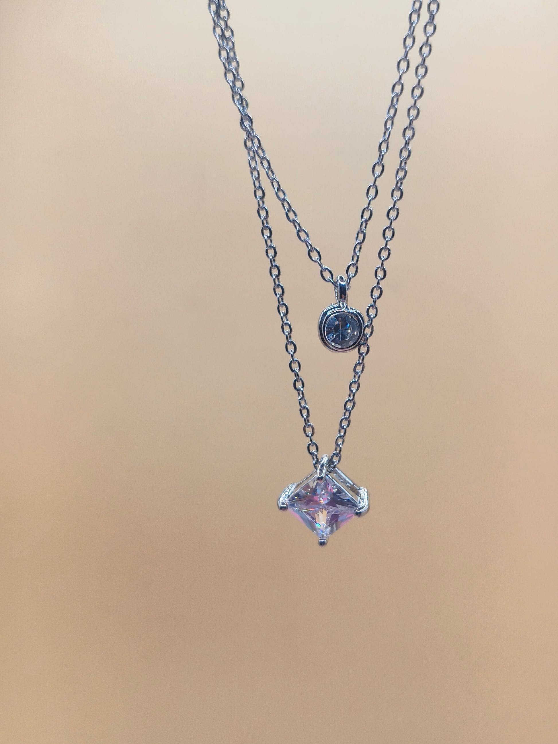 Featuring dual chains with a sparkling crystal pendant and a delicate round charm, this piece perfectly blends modern elegance with timeless beauty.