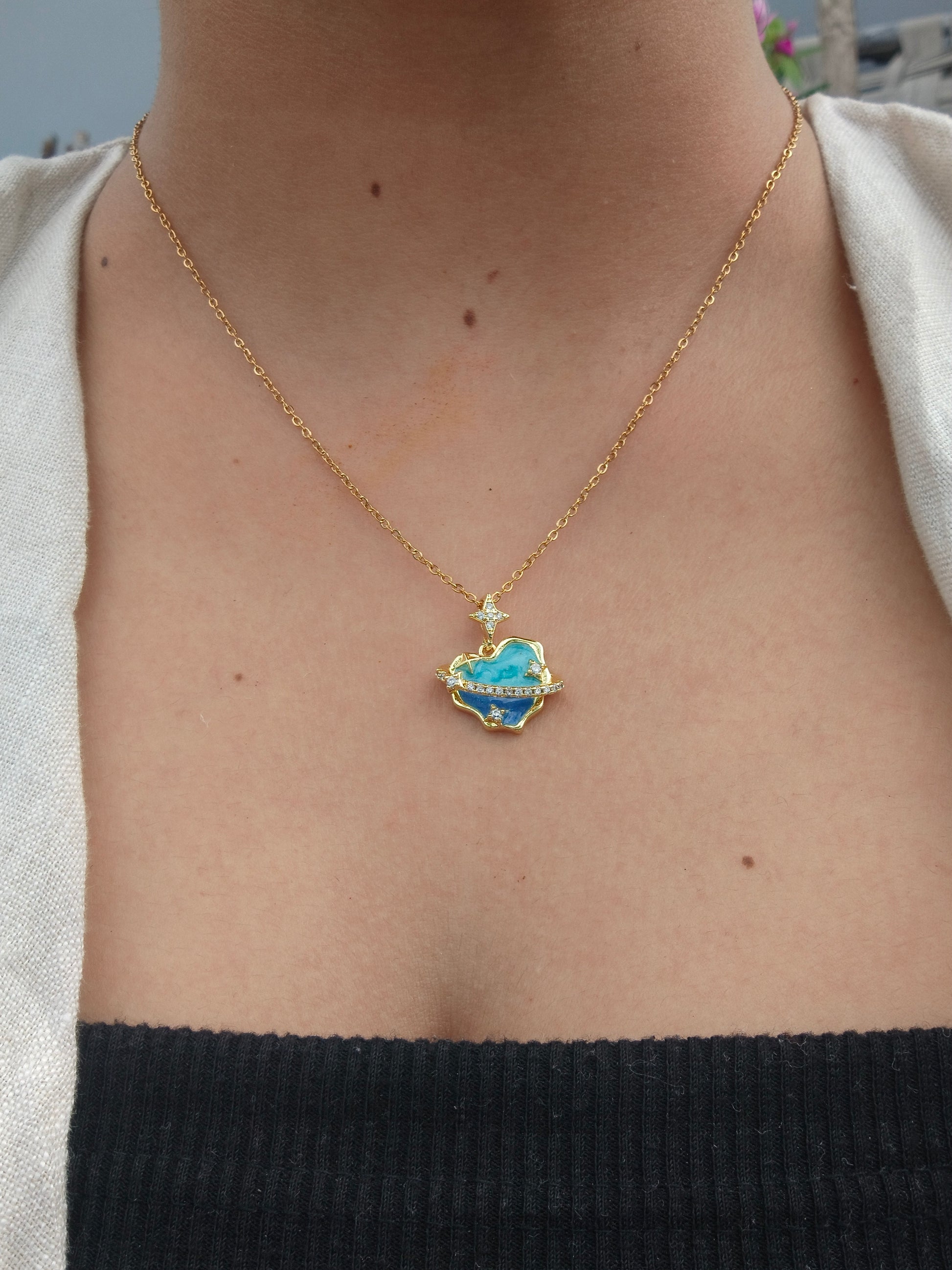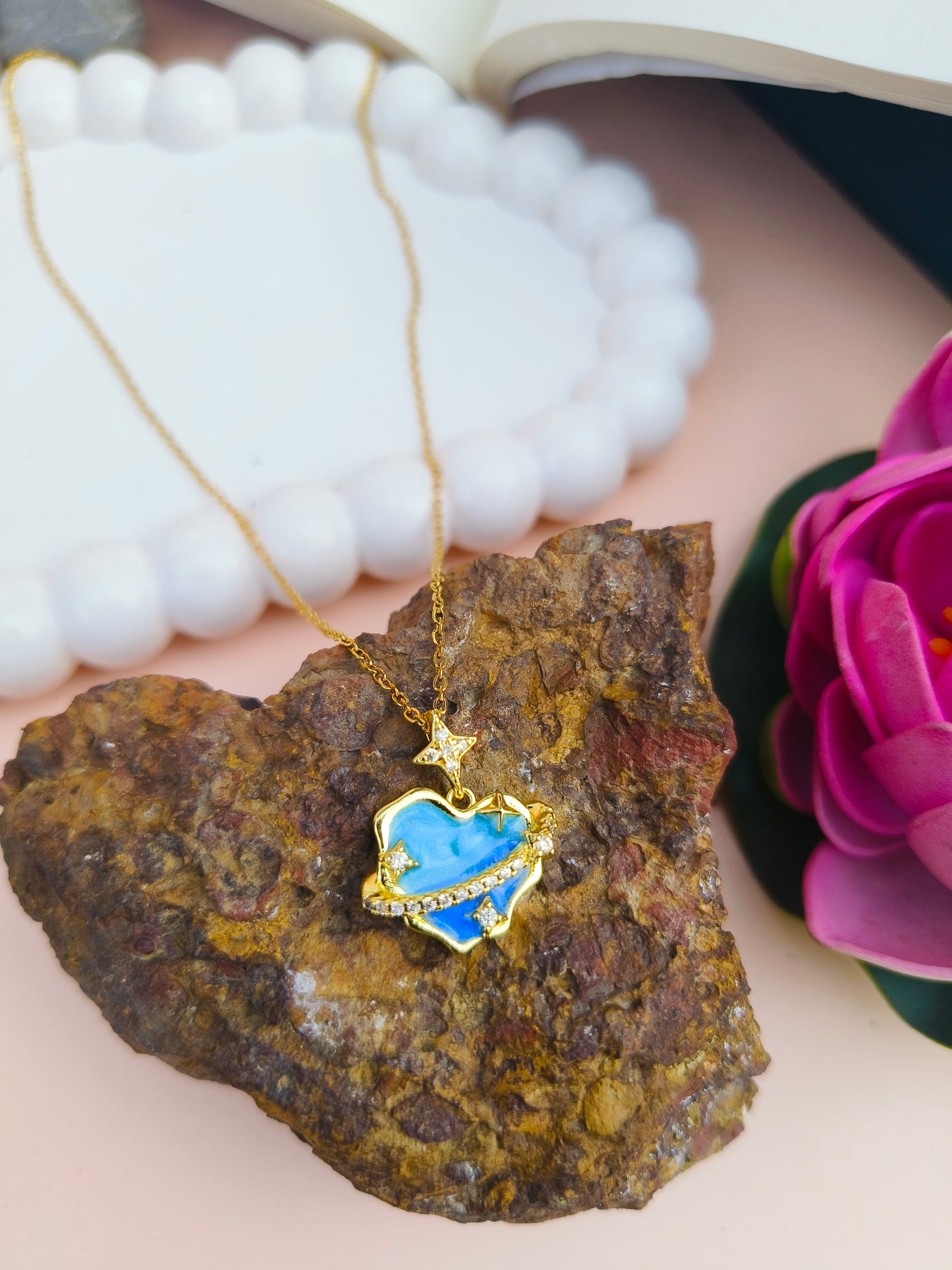 Fall in love with this enchanting stainless steel blue heart pendant necklace, designed with shimmering crystal accents and delicate star details. The vibrant blue heart is framed in a golden stainless steel finish, making it both durable and tarnish-free. Perfect for gifting or styling with your everyday looks, this necklace adds a touch of elegance and charm to any outfit.