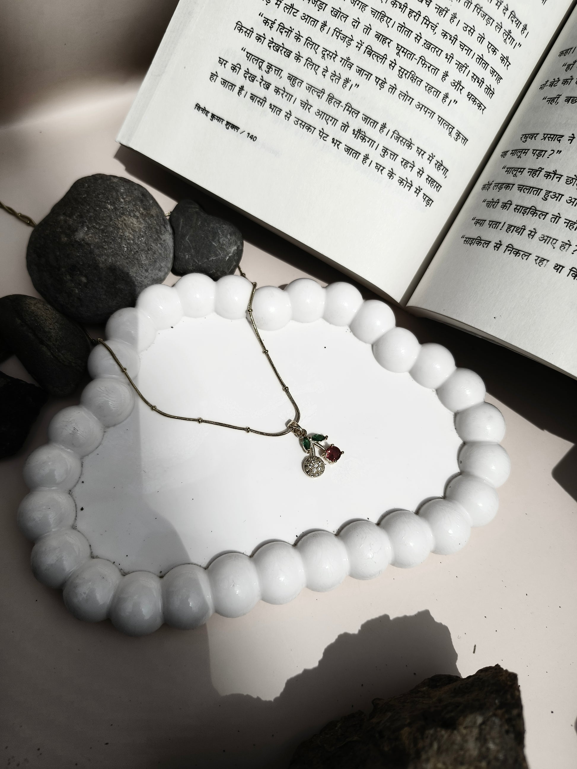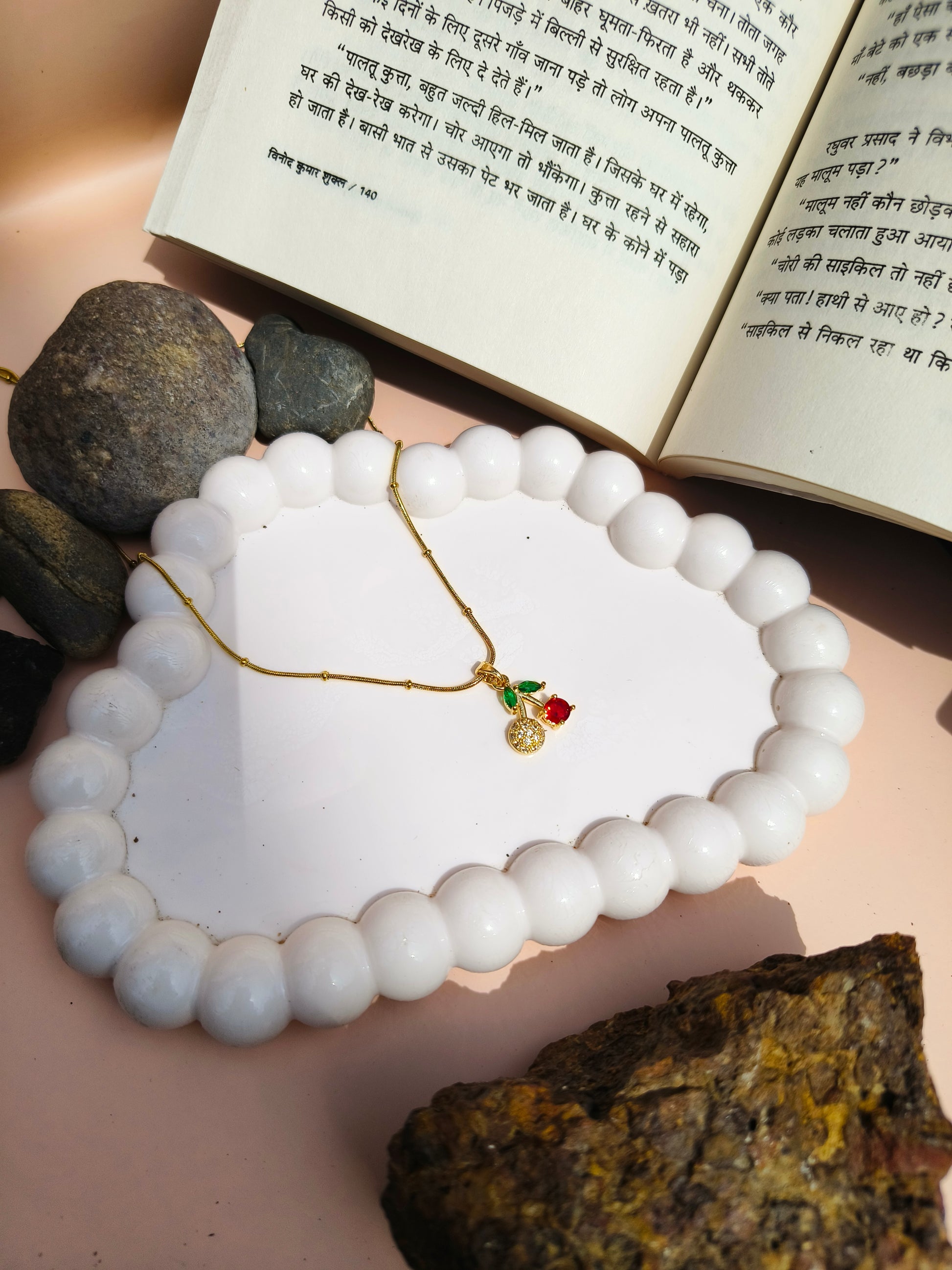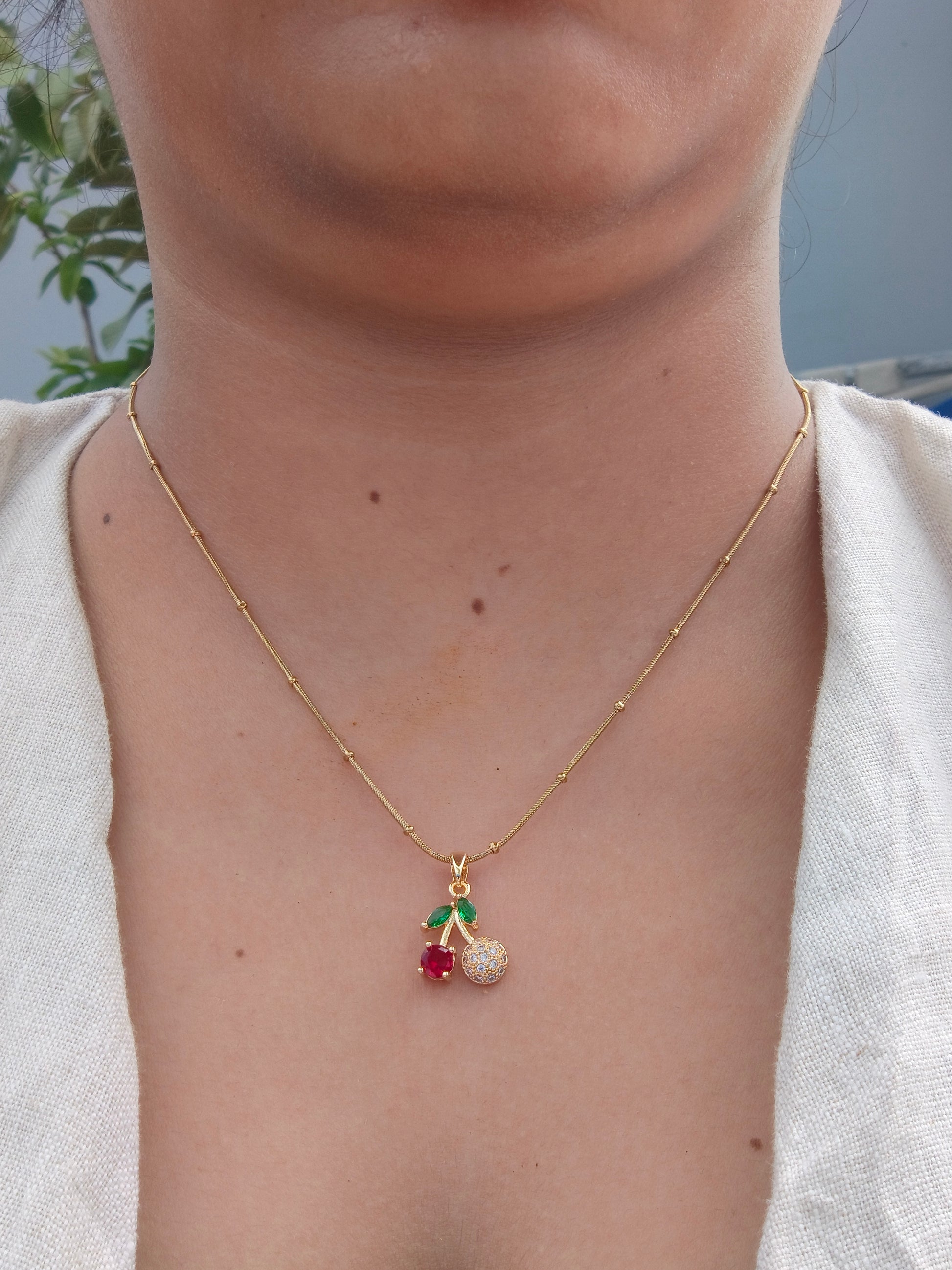 Add a playful yet elegant touch to your style with this stainless steel cherry pendant necklace, featuring a sparkling red stone, green enamel leaves, and a golden frame. Crafted from high-quality stainless steel, it is tarnish-free, durable, and lightweight – perfect for daily wear or as a unique gift for her.