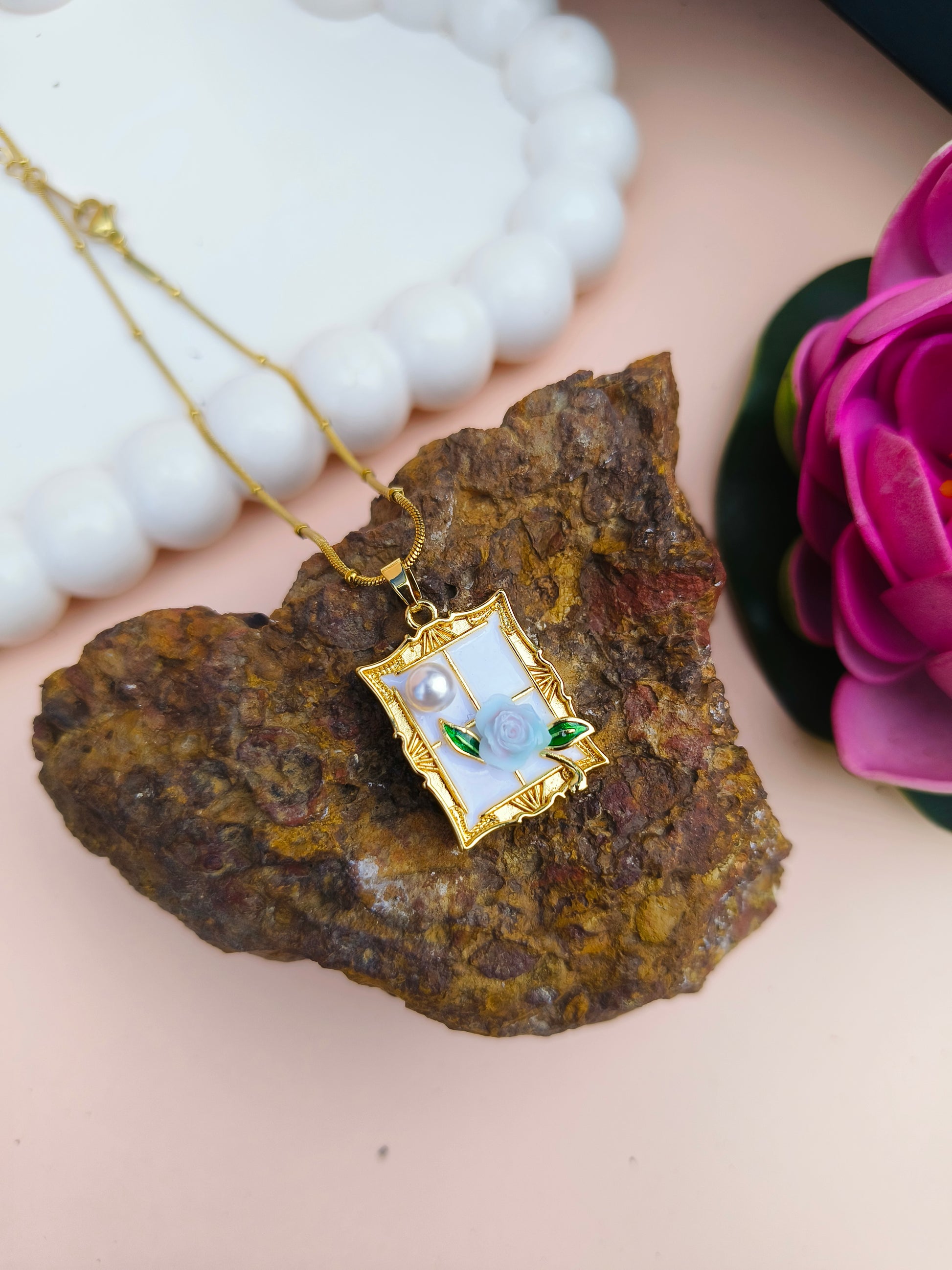 Bring timeless elegance to your style with this stainless steel floral frame pendant necklace, featuring a delicate rose motif, green enamel leaves, and a lustrous pearl accent. Set in a gold-tone rectangular frame with intricate detailing, this pendant exudes vintage charm and modern durability. Crafted in stainless steel, it is tarnish-free, long-lasting, and perfect for daily wear or special occasions.